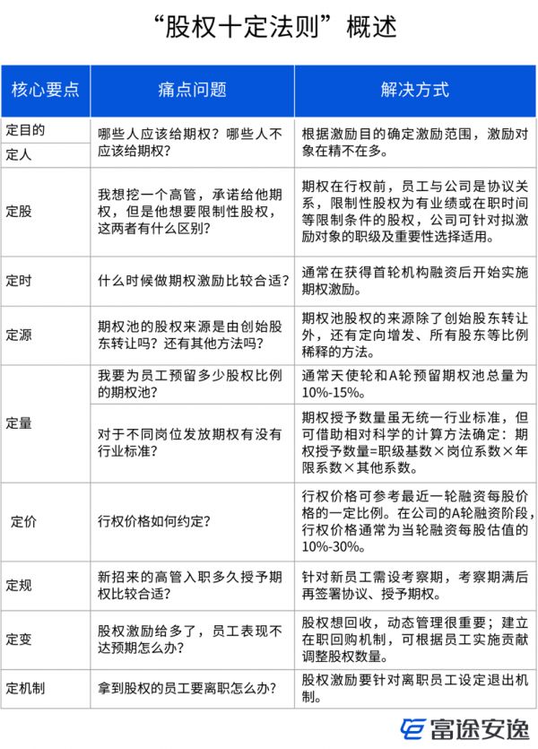 本期「富途安逸专家分享」栏目,杨柳将与我们分享,用“股权十定法则”与股权激励方案结合来逐项分析、逐步确认激励方案的有效性,避免出现激励不足或激励过度的效果。