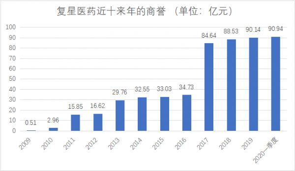 查看复星医药的商誉形成,我们发现从2009年的0.51亿元增至2020年一季度的90.94亿元,增长了178倍。