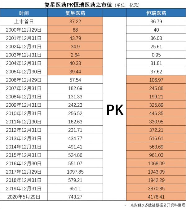 同为医药巨头,在各自的上市首日市值相差不已,却在这近二十年后出现5倍之差距。