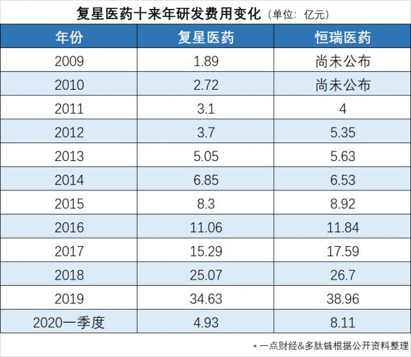 再看医药企业的核心竞争力指标——研发投入。2019年复星医药和恒瑞医药的研发费用分别为34.63亿元和38.96亿元。不同的是,复星医药在研发投入的会计处理方面更为激进。
