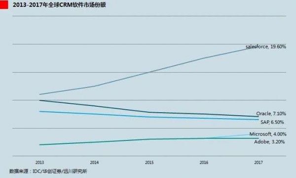然而,几个月前,SAP的市值却被1999年才成立的后浪Salesforce刚刚超越、微微领先。而在客户管理(CRM)领域,早在三年前Salesforce便已经以20%的市占率,超越了SAP、微软等前辈,登顶王座。