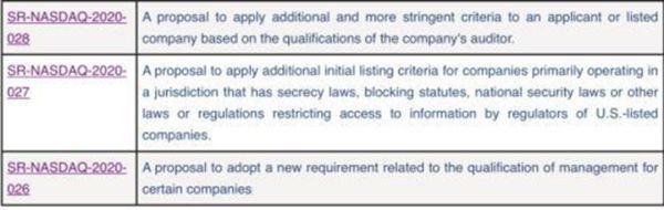 据纳斯达克介绍,向美国证交会提交的规则修订,主要是对部分国家公司的上市标准收紧。具体修订包含了三个方面,一是基于公司的审计质量、审计机构资格,纳斯达克提出新的上市要求;二是对特定区域公司,纳斯达克提出新的上市要求;三是对特定公司管理层,纳斯达克提出新的特定要求。
