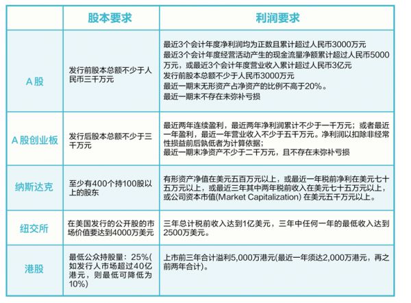 (A 股、A 股创业板、美股、港股上市标准对比)