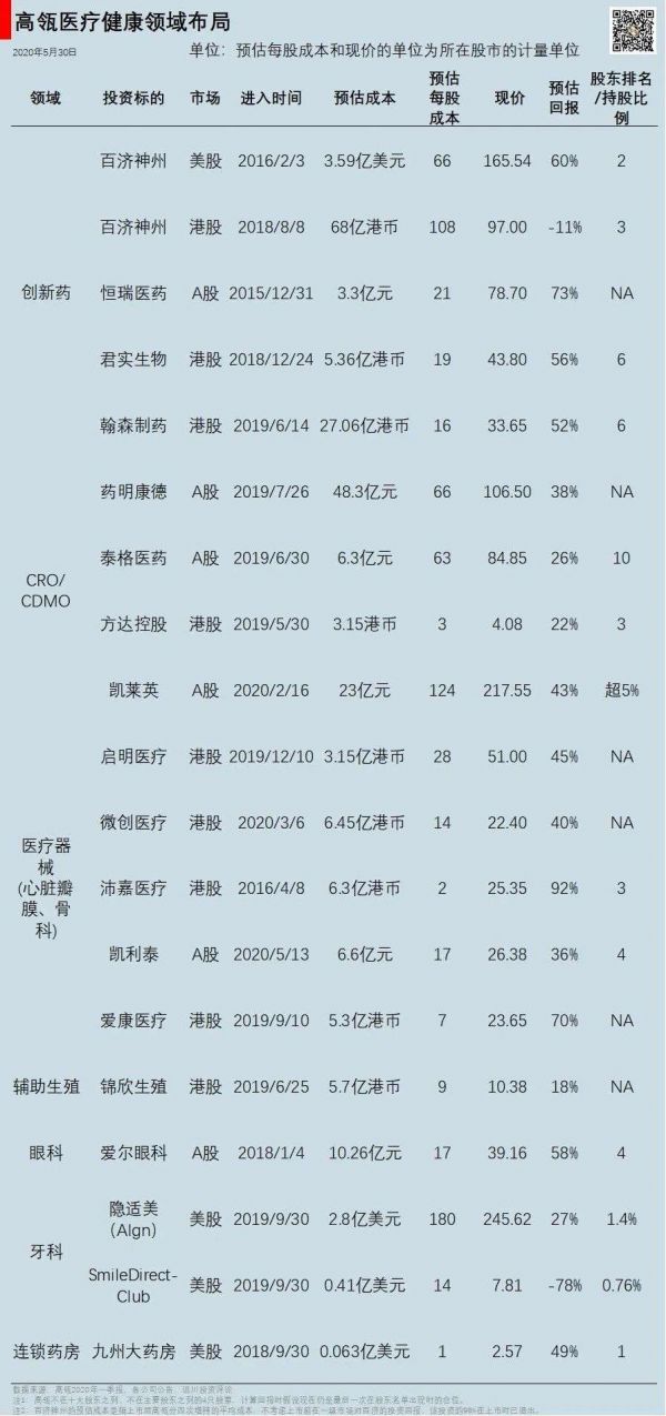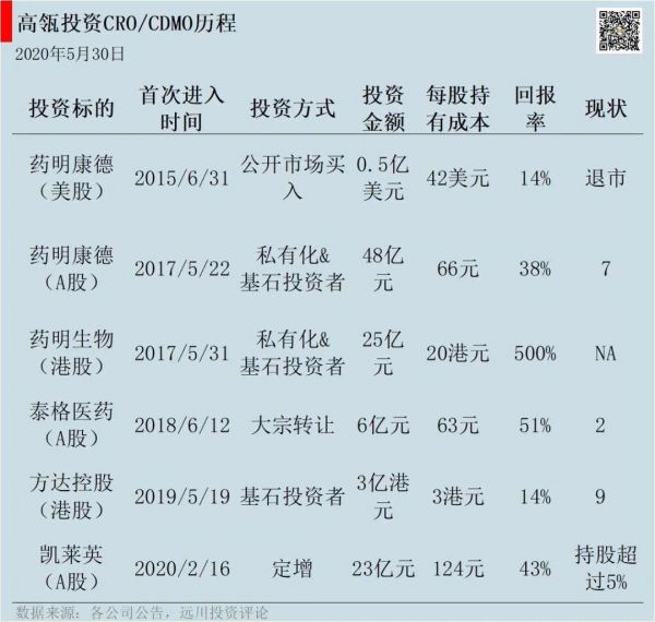 2020年2月16日,高瓴以每股124元的价格定增凯莱英,共投资23亿元。定增后高瓴持股5%以上,成为凯莱英第二大股东。5月7日,高瓴又受让了泰格医药总经理曹晓春减持的500万股,花费3.7亿元。