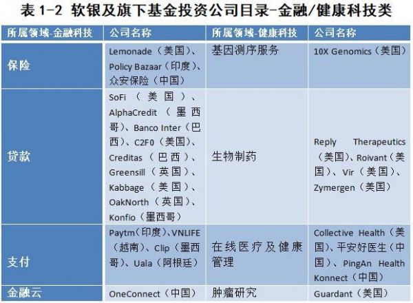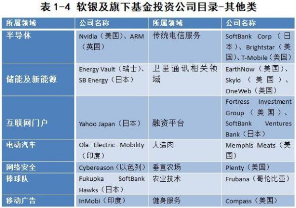 我们汇总了软银及其三只基金(愿景一期、二期和拉美基金)的投向,总共100多家公司。从区域来看,主要集中在美国、欧洲、中国、印度和拉美地区;从行业来看,主要集中在物流运输、消费娱乐、金融科技、健康科技、AI、半导体、房地产等行业(见表1)。