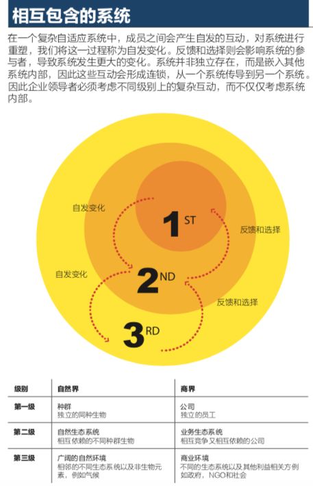 一家公司是一个复杂自适应系统,它又嵌入更广阔的商业生态系统中,该系统又嵌入更广阔的社会环境中。