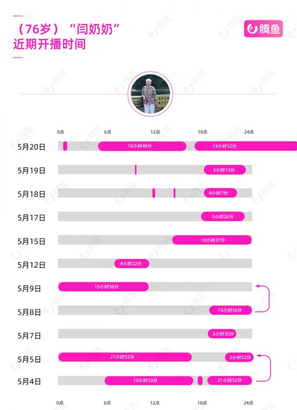 追踪闫奶奶最近14天的直播数据,腾鱼发现闫奶奶多在深夜开播,而且经常出现连续直播超过10个小时的情况。这些超长时间的直播显然没有经过策划,大部分时候只是把手机镜头对着空房间和疲惫入睡的闫奶奶拍摄而已。