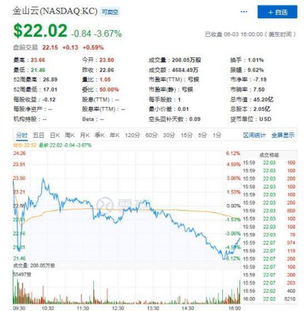 不过,受下一季度良好业绩指引的影响,刺激金山云盘前涨幅一度超4%,但开盘后却没能稳住涨势,截至当日收盘,股价下跌3.67%,报22.02美元,总市值45.2亿美元。