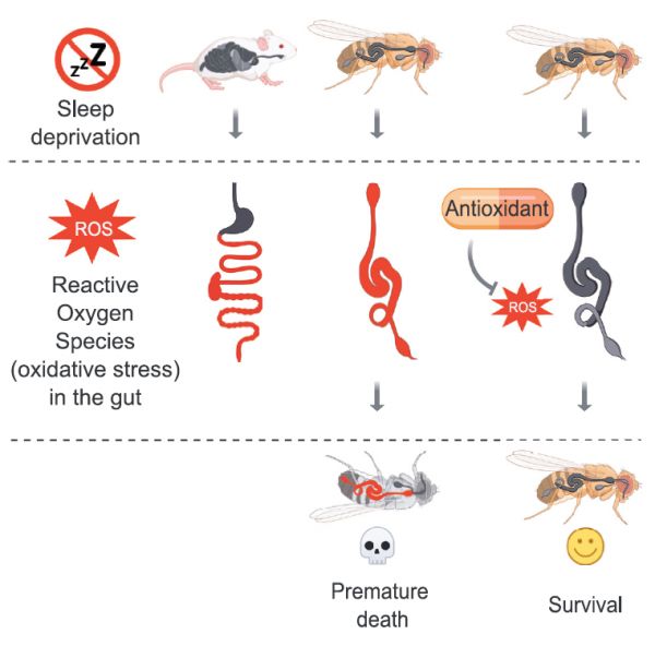 最终,在研究过程中,研究人员还是发现了二者之间的一个明显区别,那就是睡眠剥夺的果蝇肠道中堆积了大量的氧化物,这些氧化物是高反应活性氧分子,它们会大量破坏 DNA 以及细胞内的其他成分。
