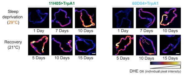 睡眠剥夺的果蝇第1、7、10天肠道ROS水平逐渐增加(上方);恢复睡眠的果蝇第5、10、15天肠道ROS水平逐渐降低(下方)