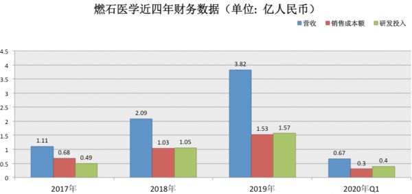 作为国内NGS肿瘤检测行业的第一梯队玩家,燃石医学近几年的营收呈现不断增长趋势:招股书显示,2017年至2019年,其营收分别为1.11亿元、2.09亿元和3.82亿元,其中对应的2018年和2019年的涨幅均超过80%。这三年的毛利率分别为64.5%、64.7%、71.6%。2020年第一季度营收为6733万元。