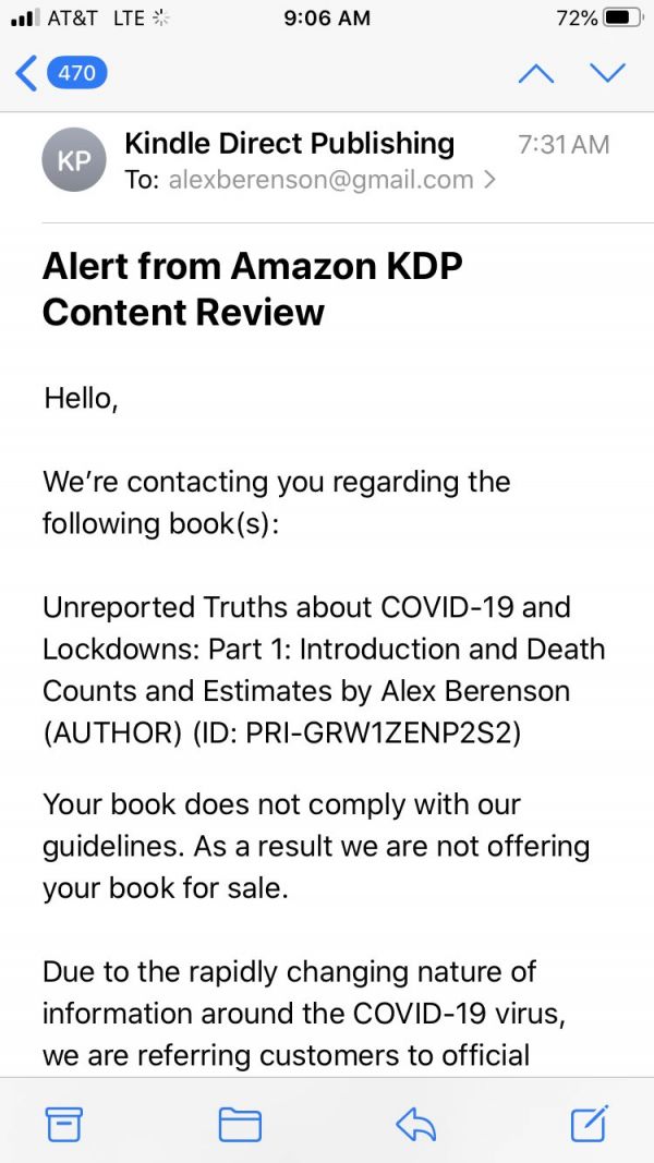 发出这个言论的起因是,亚马逊的 Kindle 拒绝出版作家 Alex Berenson 的一本有关疫情的书,书名叫做《未报道的关于新冠病肺炎和封禁的真相》(Unreported Truths about COVID-19 and Lockdowns),听起来就很阴谋论的感觉...