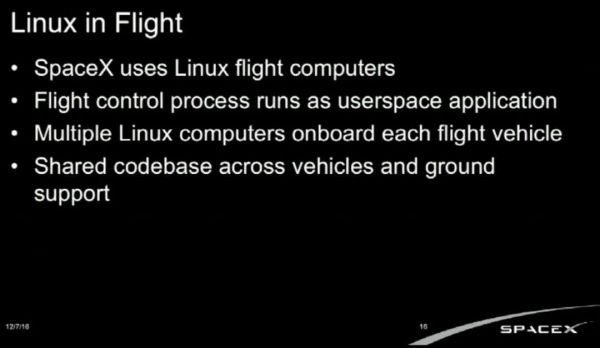 Hosein 透露所有处理器上运行的都是 Linux 实例,共享 codebase,采用的是 C++ 语言,在 LabVIEW 环境下开发——形象来讲,整个火箭加上飞船上运行着一套小型的 Linux 计算集群。