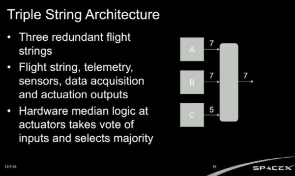 2016年,时任 SpaceX 软件工程副总裁的 Jinnah Hosein 在一个大会上演讲时,提到了很多关于猎鹰9号/龙飞船电脑系统的细节。其中最有趣的一个关键词,就是三重冗余 (triple redundancy)
