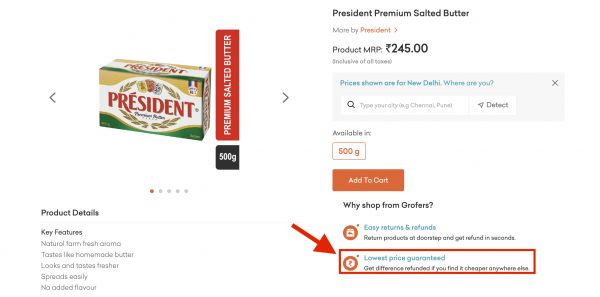 Grofers 官网上可以看到价低退款的字样