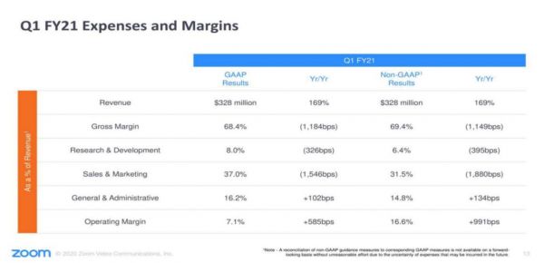 ZoomQ1实现收入 3.28 亿美元,同比增长169% ,受累于疫情期间免费用户大幅增长,毛利率下滑了11%,但仍处于较高水平达69.4%。