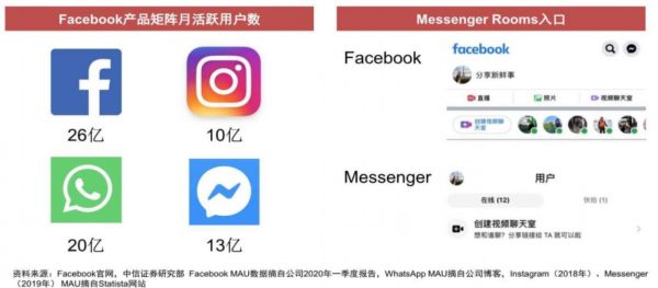 在多渠道方面,Facebook有强大优势,Facebook用户可以在Messenger App及Facebook新闻推送群组和活动页面上创建并分享聊天室。同时Facebook计划近期在其旗下Instagram Direct、WhatsApp及Portal软件上增加视频聊天室创建、分享渠道。