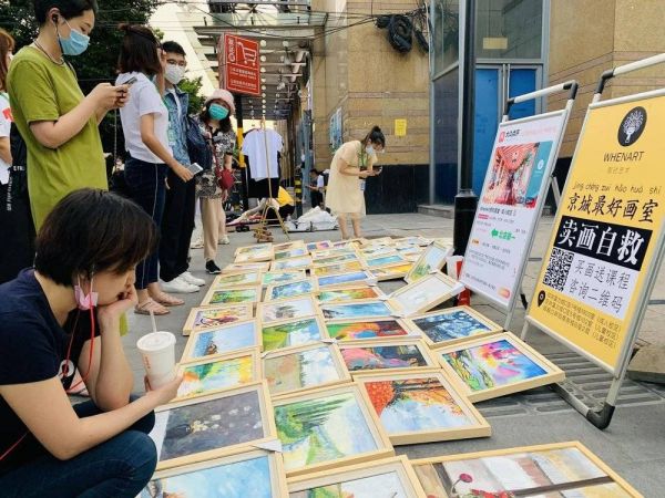 5月19日左右,我们才正式恢复营业,只有一个成人校区,两个儿童校区还关着,营业时间也缩短了一些,没什么人来,大家都刚刚复工,还有学生会有一些安全上的顾虑,没有新客源。我们现在摆摊,买一幅画送两节体验课,也是为了做点宣传,真靠卖画肯定是维持不下去的。