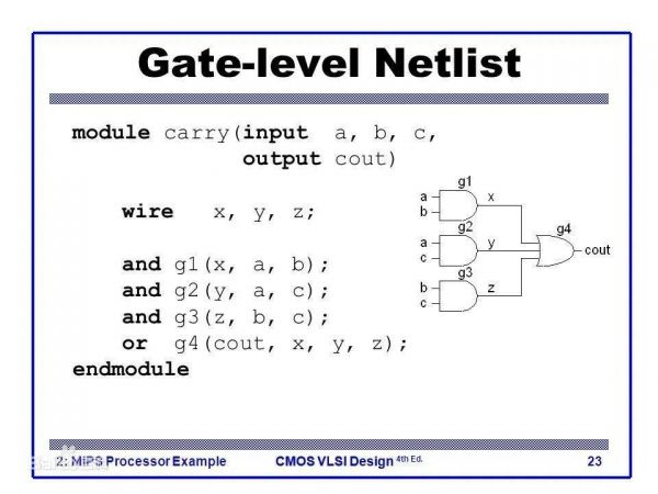 至于什么是门级网表,门级网表就是一张设计图,这张图里的单元就是“门”。如果对半导体有基础的了解,就知道里面的基础逻辑单元是“与门”、“非门”、“与非门”等等,门级网表就是由这样的门单元绘制成的一张电路图。简单的门级网表就长这样,但是实际上很复杂。
