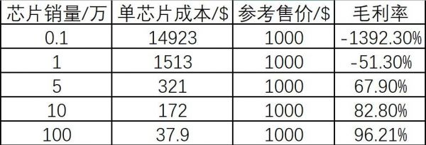 可以看出,相比单颗芯片的可变成本,芯片的固定成本是极高的,因此,我搭建了一个简单的、芯片成本基于芯片出货量的敏感性分析。