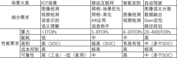 对于云端芯片来说,其下游面对的场景具有较大的通用性,但是对于边缘推理则不然。下表列出来不同场景对边缘推理芯片的性能要求: