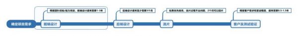 对于Fabless芯片企业来讲,企业所做的主要是需求确定和前端设计,这部分耗时比较久,可能需要1~3年的时间,具体要看公司团队的能力和经验,如果团队设计能力较强,可能一年就能完成前端的设计。