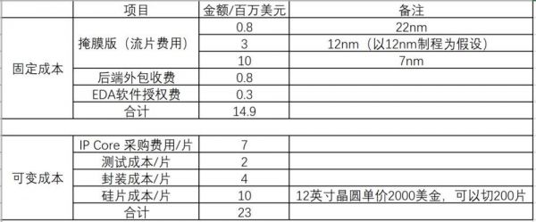 首先我们对芯片生产中的Fixed Cost 和Variable Cost做一个区分:芯片的固定成本包括流片费用、后端外包费用、EDA软件授权费等;可变成本包括IP采购费用、测试成本、封装成本和生产时的硅片成本。具体见下表: