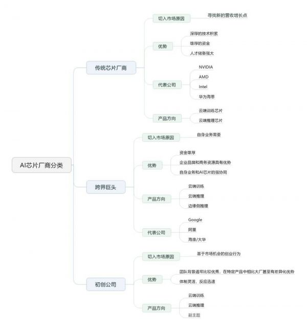 具体到竞争格局,AI芯片行业有三类企业:传统芯片厂商,巨头跨界和初创公司