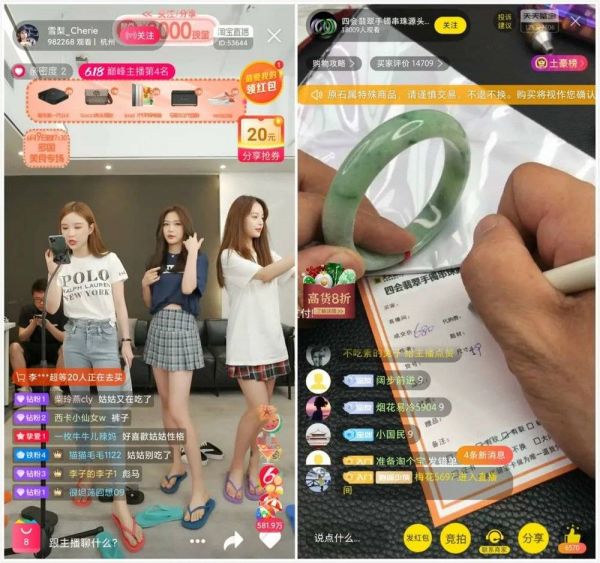左为淘宝直播间画面,右为鉴宝账号直播间,可以看出其电商基础设施的差异