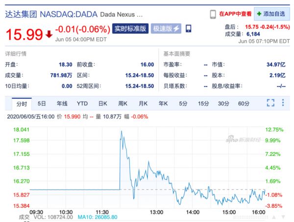 达达发行价16美元,开盘价18.3美元。在当天美股大涨的背景下,达达盘中一度跌至15.24美元,最终收盘15.99美元,即时市值34.97亿美元。