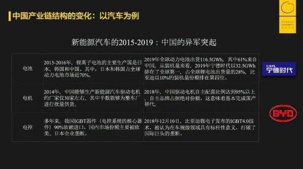 我们举了几个简单的例子,如果我们只讲新能源汽车,从2014年开始中国变成了全球最大的新能源汽车市场。事实上,我们的汽车从2009年开始就成为全球最大的单一汽车市场,只不过从2009年到2014年最大的不同是我们换了个跑道,我们从燃油发动机换到了电池。电池的核心技术是正极、负极、隔膜和电解液。
