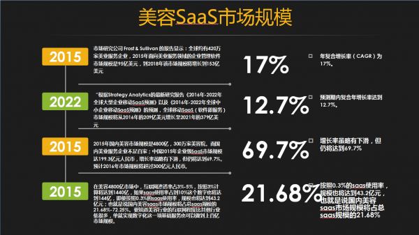 依托技师技术和服务开展的美业线下门店营销活动也受限于中小型美业门店的推广营销能力,仅限于口碑传播和朋友圈店铺自有微信发布广告的封闭壁垒。随着SaaS + Supply chain + Service 的 3S 模式逐渐深入美业,美业SaaS平台业务也不断垂直细分。