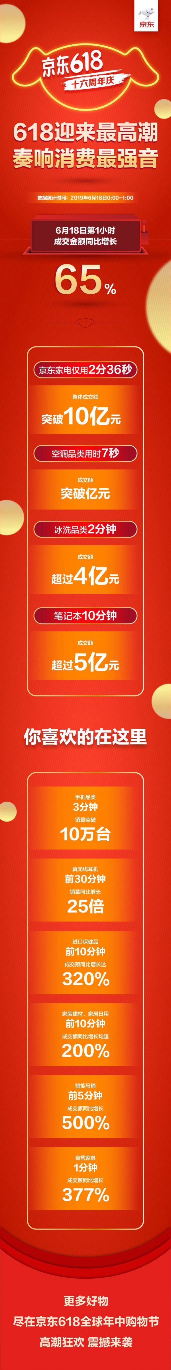 @虎嗅 从18日零时起,2分36秒,京东家电整体成交额突破10亿元大关,其中空调品类仅用时7秒成交额突破亿元,冰洗品类2分钟成交额达到4亿元以上,美的、海尔、格力三大品牌均在3分钟内突破亿元大关。第一个小时的成交金额同比增长65%。