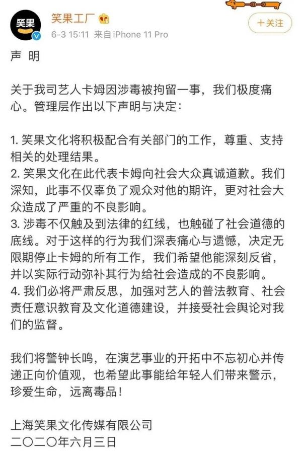 就在池子发长文斥笑果文化侵权不足一个月时间,这家公司再度因旗下艺人卡姆被推至聚光灯下。6月3日,据上海市公安局虹口分局今日消息,艾力卡木阿斯克尔(卡姆原名)等人因吸毒案被行政拘留十日。当天,笑果文化火速回应称,决定无限期停止卡姆的所有工作。