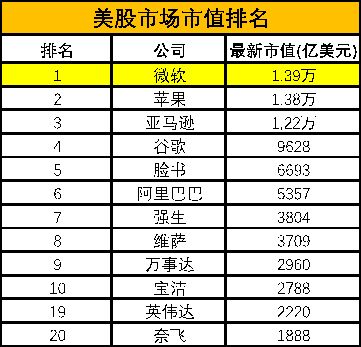 我们来看一下美股市场市值最新排名表,大家观察下排名前6的公司会发现,它们无一不是互联网高科技公司,一些传统型公司的排名已经渐渐后移了。