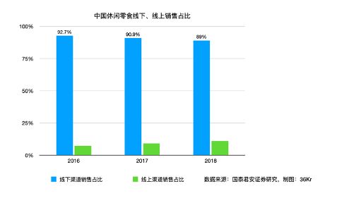 具体来看的话,首先,可以从下图看出,休闲零食行业的销售额绝大多数仍然来自于线下。