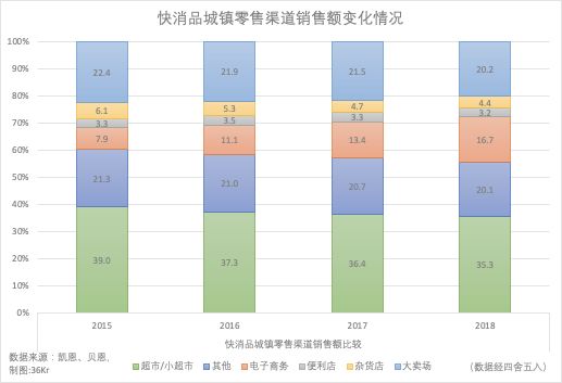 传统快消品渠道包括便利店、专营店、杂货店、大小超市、大卖场等零售业态,但近些年电商渠道一枝独秀,占比不断提高。来自贝恩咨询的一项数据显示,电商渠道2014年~2018年年复合增长率达到35.1%。