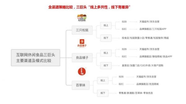 事实上,三巨头近年来都在尝试摆脱对单一渠道的依赖,进行全渠道布局。线上渠道集中规划为B2B、B2C 两种模式,前者表现为天猫超市、京东自营入仓模式,后者为在平台开设品牌旗舰店;良品铺子早前曾有网店商户经销业务布局,但后续出于优化渠道管理难度考虑,已逐步将该类业务停掉。