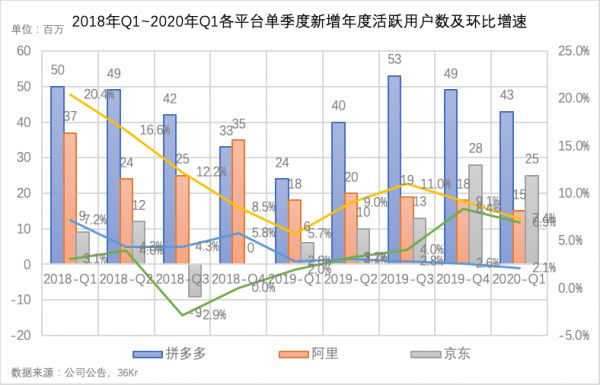 2017Q1~2020年Q1阿里、拼多多、京东年度活跃用户数变化趋势
