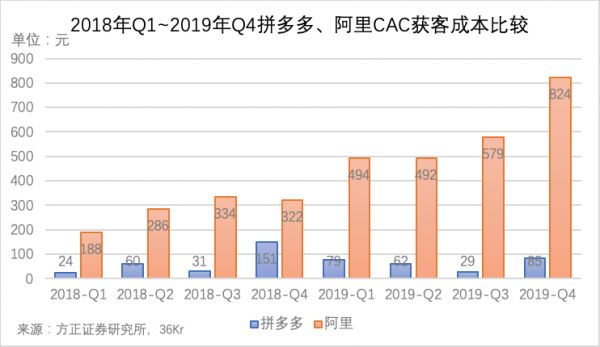 2018年Q1~2019年Q4拼多多、阿里CAC获客成本比较