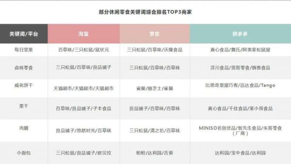 休闲食品包括坚果、卤制品、膨化食品、方便食品等主要类目,不同于三巨头在淘宝、京东渠道部分关键词综合排名占据Top3牢固地位,拼多多完全是另一种品牌生态,国际大牌、厂牌、食品经销商、传统品牌、新品牌等鱼龙混杂,市场竞争激烈。