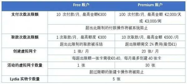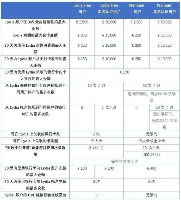 产品服务从服务载体可分为Lydia APP与Lydia Card两类,两类服务针对免费客户及高级客户在单项收费及限制方面也存在差异。