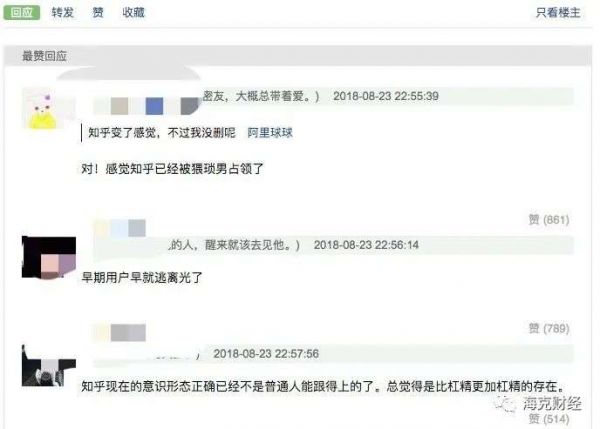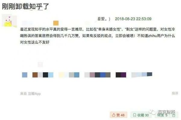 社区发展的另一倾向是,女性用户正在流失。这令人感到诧异,但又很好理解。知乎上关于民族、家国的讨论越来越多,同时,在谈到女性权利问题时,理性讨论在变少。某用户曾在豆瓣发文讲述自己卸载知乎的原因时提到,知乎上对女性冷嘲热讽的答案会得到几千几万赞,如果有反驳的观点,立即会被喷。