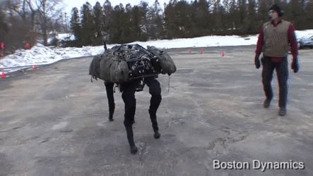波士顿动力起初靠军方合同维持生计,由于军用机器人对承载力有一定要求,所以波士顿动力的四足机器人主要以液压驱动为主。BigDog「狗如其名」,身体长宽都接近 1 米。BigDog 表现出良好的运动能力,它的主要用途是在复杂地形上载重,能够攀爬最大 35 度的斜坡。四条腿拥有「关节」,能够减震,每迈出一步能够回收部分能量,带动下一步。BigDog 在民间的走红还是因为视频里被测试人员「无情」地踹了一脚。