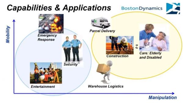 2018 年,Raibert 在 CeBIT 会议上提出了对自家机器人产品的落地愿景。以操纵性(manipulation)为横轴,移动性(Mobility)为竖轴,Raibert 认为娱乐功能、应急响应、安保是波士顿动力短期内从操纵性和移动性两点考虑可以聚焦的应用场景,仓储物流、配送以及工程建设、看护服务则是着眼于中期和长期的目标。可见,承载 Raibert 最大希冀的四足机器人也才刚刚起步。