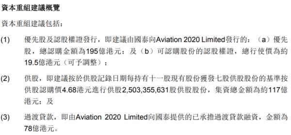 根据公告,国泰航空的资本重组计划包括:发行优先股、认股权证、供股及过渡贷款融资,融资对象主要为Aviation 2020 Limited,后者将向国泰航空认购195亿港元的优先股、19.5亿港元的认股权证;以及为国泰提供过78亿港元的过渡贷款。此外,国泰航空还将向现有股东配发117亿港元的供股股份,第一大股东太古股份届时将认购53亿港元。