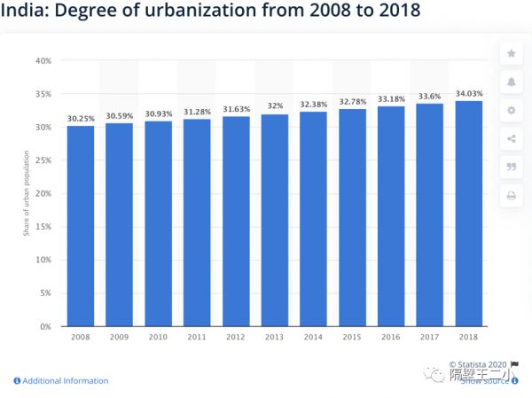 2019年,印度城镇人口大约4.7亿,占总人口34.43%,按照目前印度城镇化进度预估,达到50%的城市人口需要25年左右。(国内达到这一目标大概8年时间)