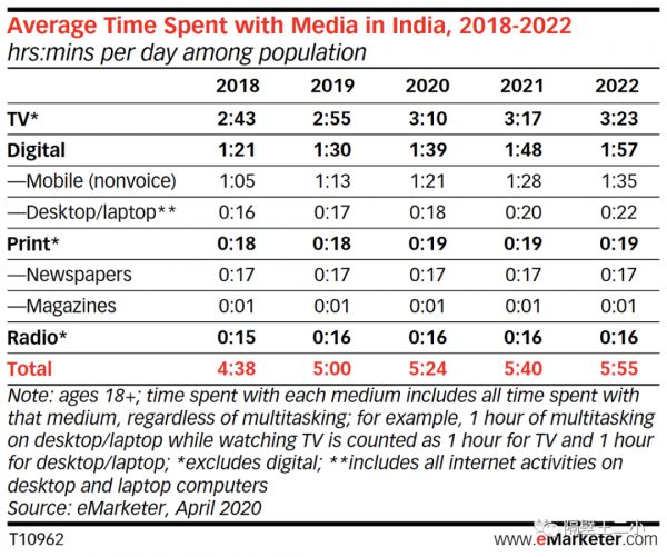2020年,预计印度成年人将平均每天使用传统媒体3小时45分钟,占其日常媒体时间的69.5%。数字平台将占剩余的30.5%,即1小时39分钟。