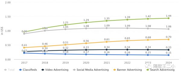 其中印度最大的细分市场是搜索广告,预计2020年市场规模为9.66亿美元。