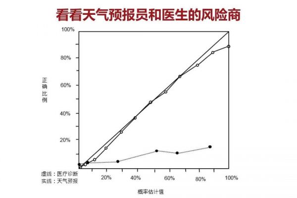 我们看到,代表天气预报员风险商的实线非常贴近完美线。而另外一条看起来非常离谱的虚线则是医疗诊断线。当医生说某人得某种病的概率为30%,实际上得病的概率不足5%;当医生说某人得某种病的概率已达90%,实际患病率也仅仅只有10%。